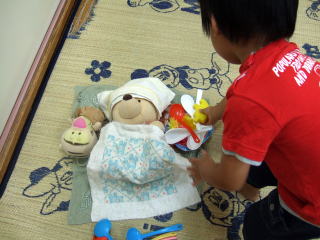 ぷーさんを寝かしつけてあげています。 (2才児) |