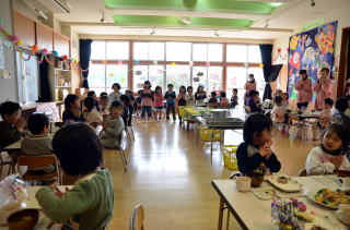 くじら組さんが小さいみんなのおかずを取り分けて あげるのも今日で最後だね。心なしかいつもより 率先して取り分けてあげていたね。 |