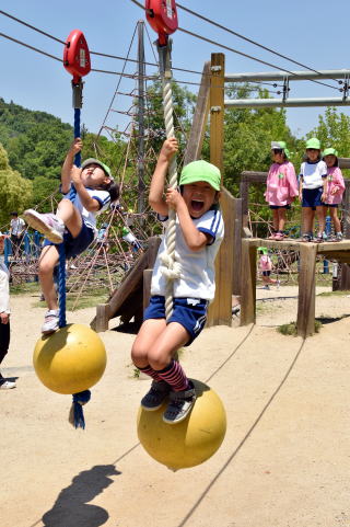| 保育園にはない豪快な遊具を思い切り 楽しみました。これはロープスライダー。(5才児) |