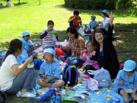 大型バスに乗って、お弁当を持って、おうちの人と一緒に遠足。