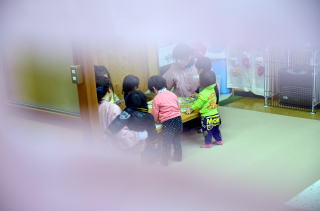 小さいクラスはどうしてもおうちの方が気になって 普段と違う様子になってしまうので、覗き穴から そっと見てもらいました。(1才児クラス) |
