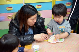 | 1歳児クラスは親子あそび。小麦粉粘土でケーキを作りました。 | 得意な歌もおうちの方に聞いてもらいました。(4才児) 園長が用事で給食の風景は撮れませんでした(^_^;)。 | |