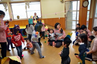 | その後、福の神がやってきて”しあわせ”を くれました。手作りの“しあわせ”を「はい、 しあわせ。」と渡す不思議なやりとり。(0才児) |