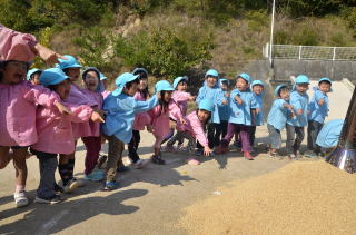 | 全員運動場に集まっておいもを食べました。 「あつっ!はふはふっ」「おいしいよ!」(3才児) |